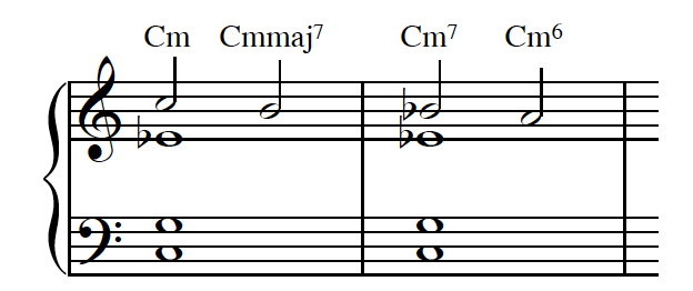 Melodías implícitasA veces se escriben contramelodías simples expresadas en la notación de los acordes.Si la conramelodía está en la voz superior o una intermedia, puede escribirse como una secuencia de acordes. En qué voz se interprete, es decisión del que toca.