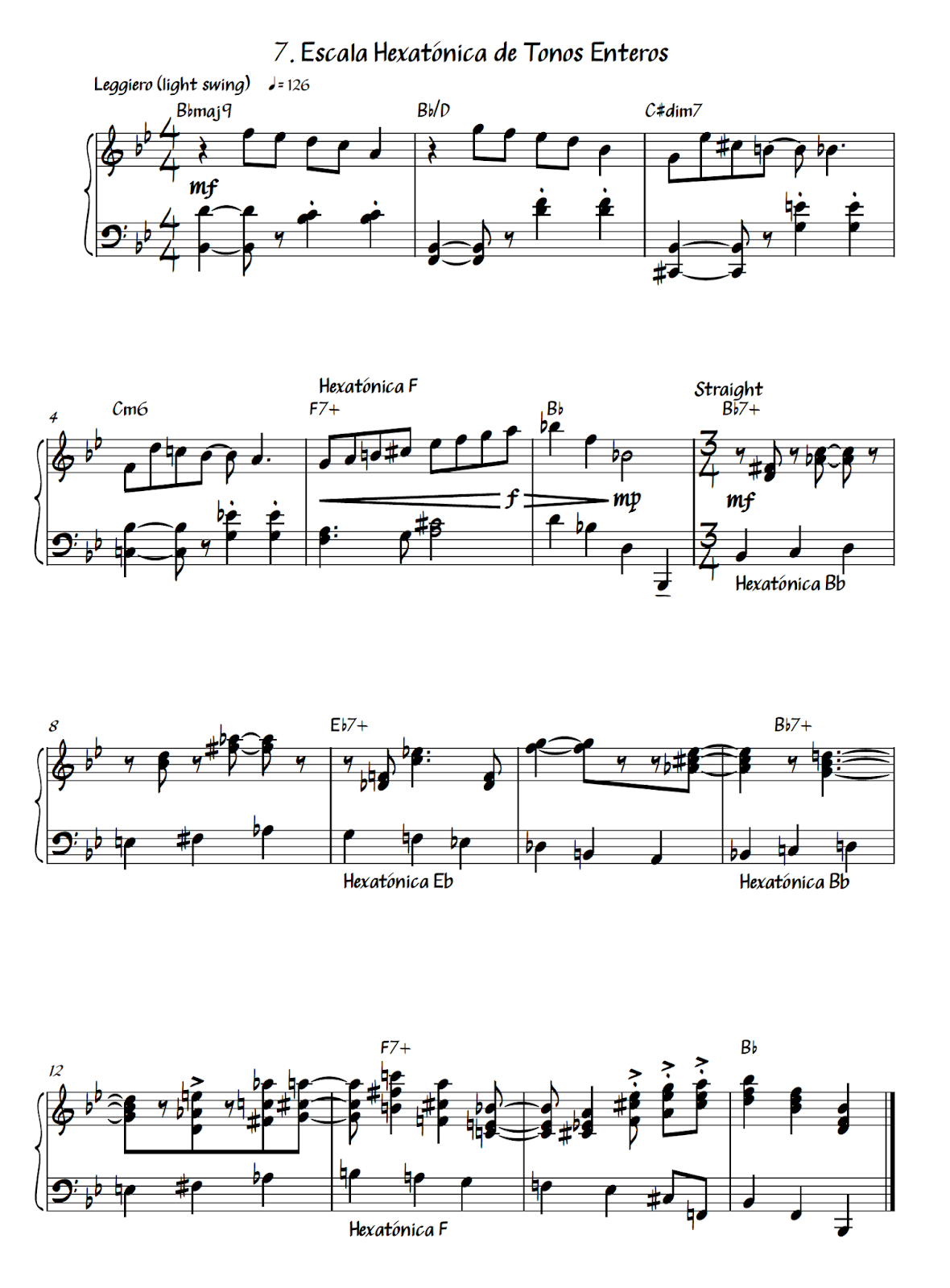 Esta pequeña pieza en Bb major utiliza la escala de tonos enteros en el compás 5 sobre el dominante F7+.