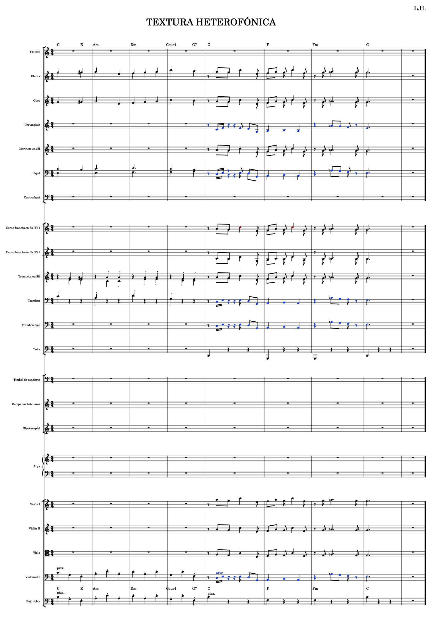 HETEROFONÍA significa "voces diferentes". Aplicado a la orquesta tenemos unan línea melódica principal con otras líneas concurrentes que son reconocibles como melódicas pero diferentes para crear variedad y sorpresa.