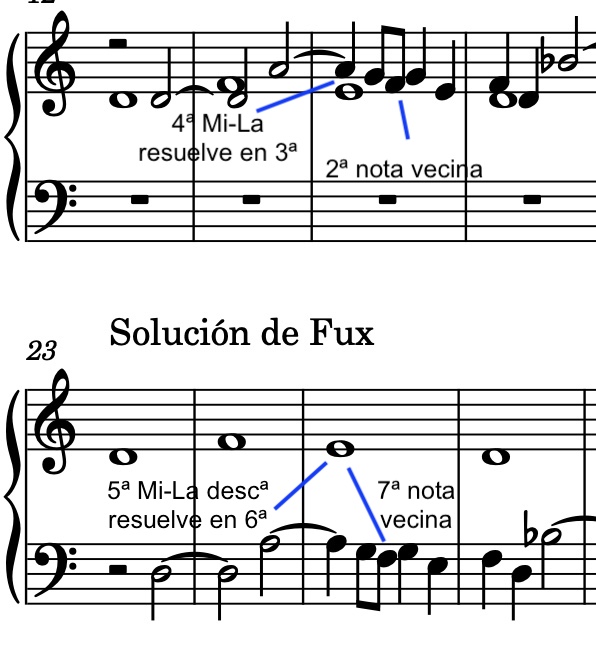 Observemos como Fux sí utiliza (en el contrapunto inicial) intervalos disonantes, incluso segundas, cuartas y séptimas. Pero so siempre en posiciones débiles o preparados y resueltos debidamente. Por ejemplo: